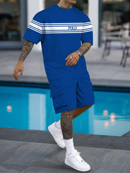 Men's fashion casual color matching printed short sleeve pocket shorts two-piece set