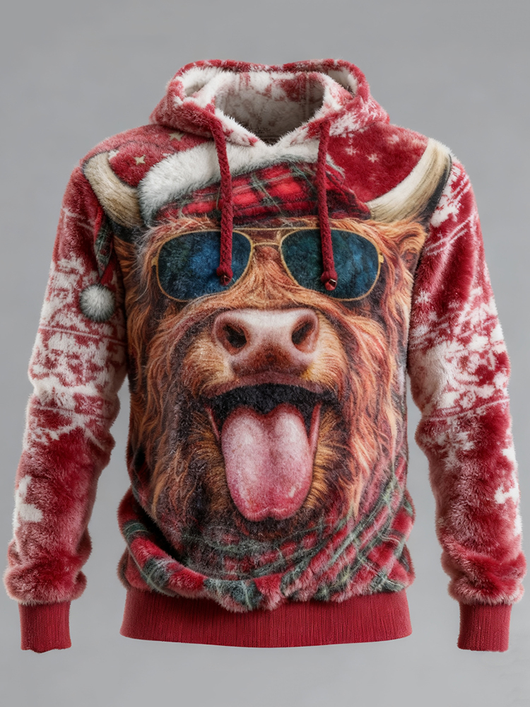 Simpfit Herren-Flanellhoodie mit lustigem Weihnachtsmotiv und Hochlandrind-Print, lang?rmelig