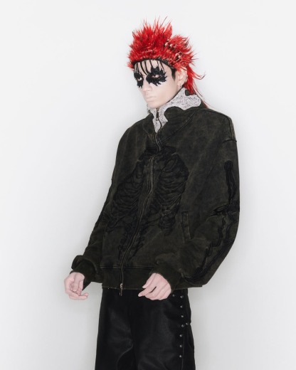 - Full-zip hoodie with an inner crusader cross mask lining. Embroidered skeleton lines run across the body and extend into the hood. Naturally moss-washed for a worn, ancient feel.